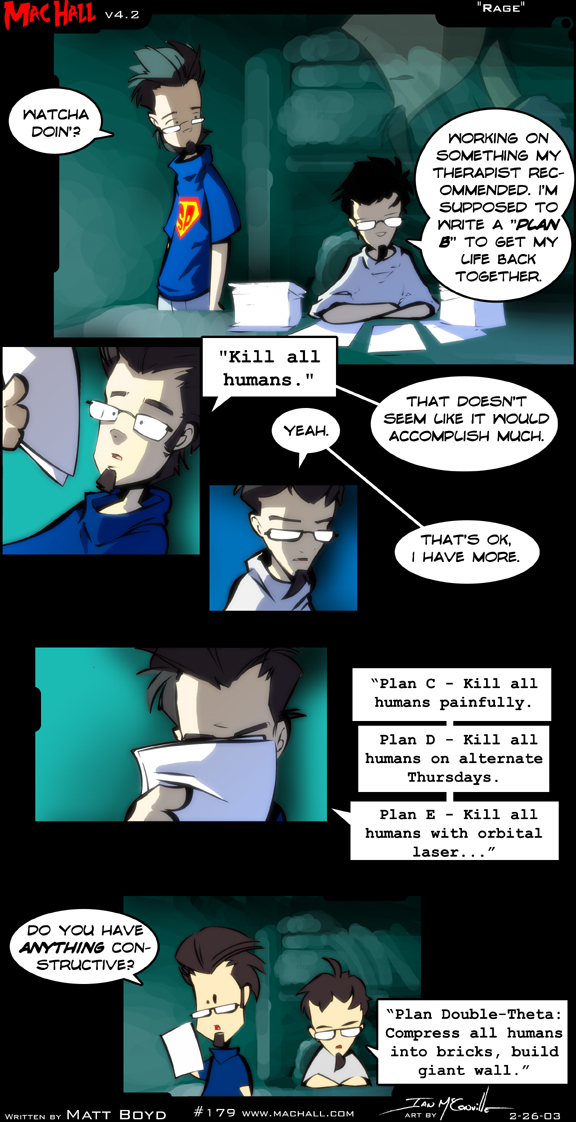 hopefully in future reviews (feh.) I'll get more in-depth with my opinions of these comics. I am capable of critiquing and discussing webcomics but I never really do it publicly ... This review isn't really supposed to be all that serious as I just wanted to make a new entry here.. and to brain vomit about webcomics. I'm off to bed now I'm tired as shit .. and happy december